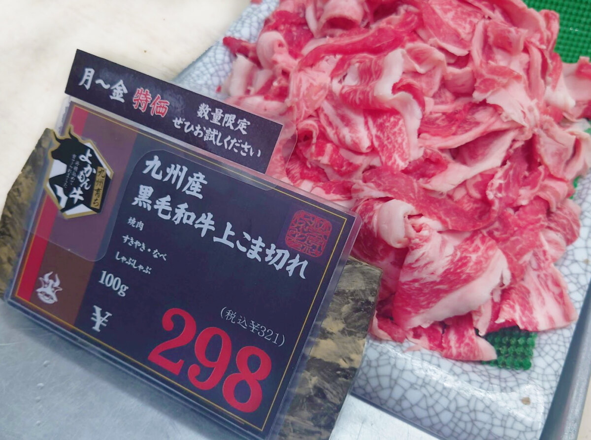 鹿児島県産 黒毛和牛「よかもん牛」 上こま切れ 特価にて販売中 100g298円!